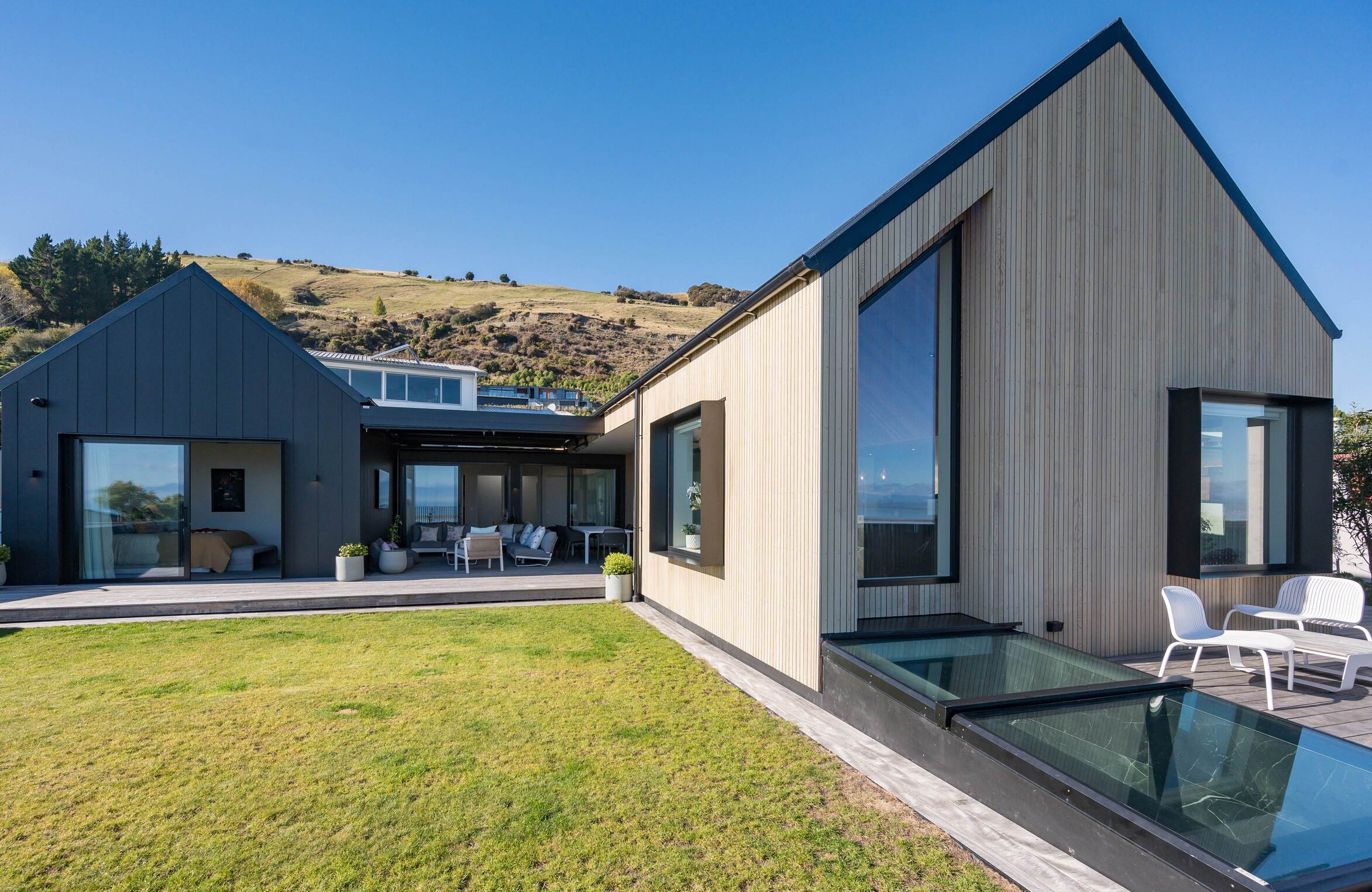 When asked about the standout elements, Amy Taylor, director of Mecca Built and homeowner, said, “The external plastering. The look was to achieve something that looked like concrete panels but with a plaster finish. It hadn’t been done before, and Adam from Nelson Plaster Solutions was great to deal with and chose the two colours to blend in to look like concrete.” The home’s careful positioning ensures it takes full advantage of the breathtaking views, while “the green roof over the garage is a standout feature” says Jorgen Andersen, Director of Arthouse Architecture Ltd—an innovative solution that extends the landscape and offers a rare flat lawn in a hillside setting.