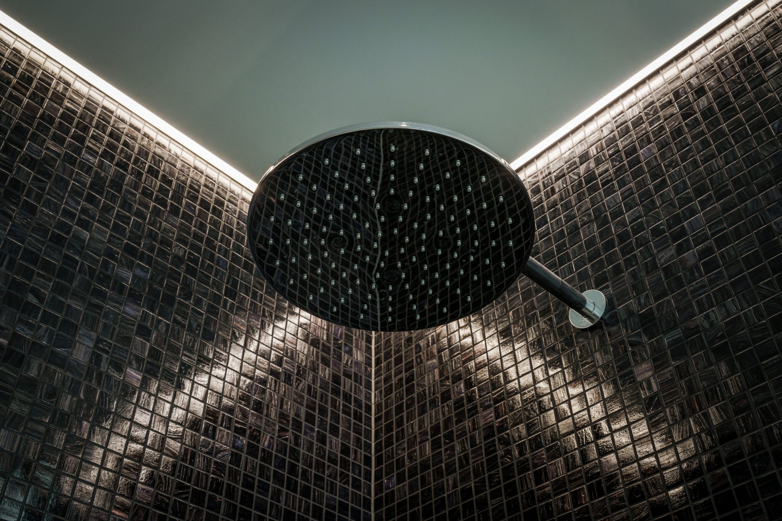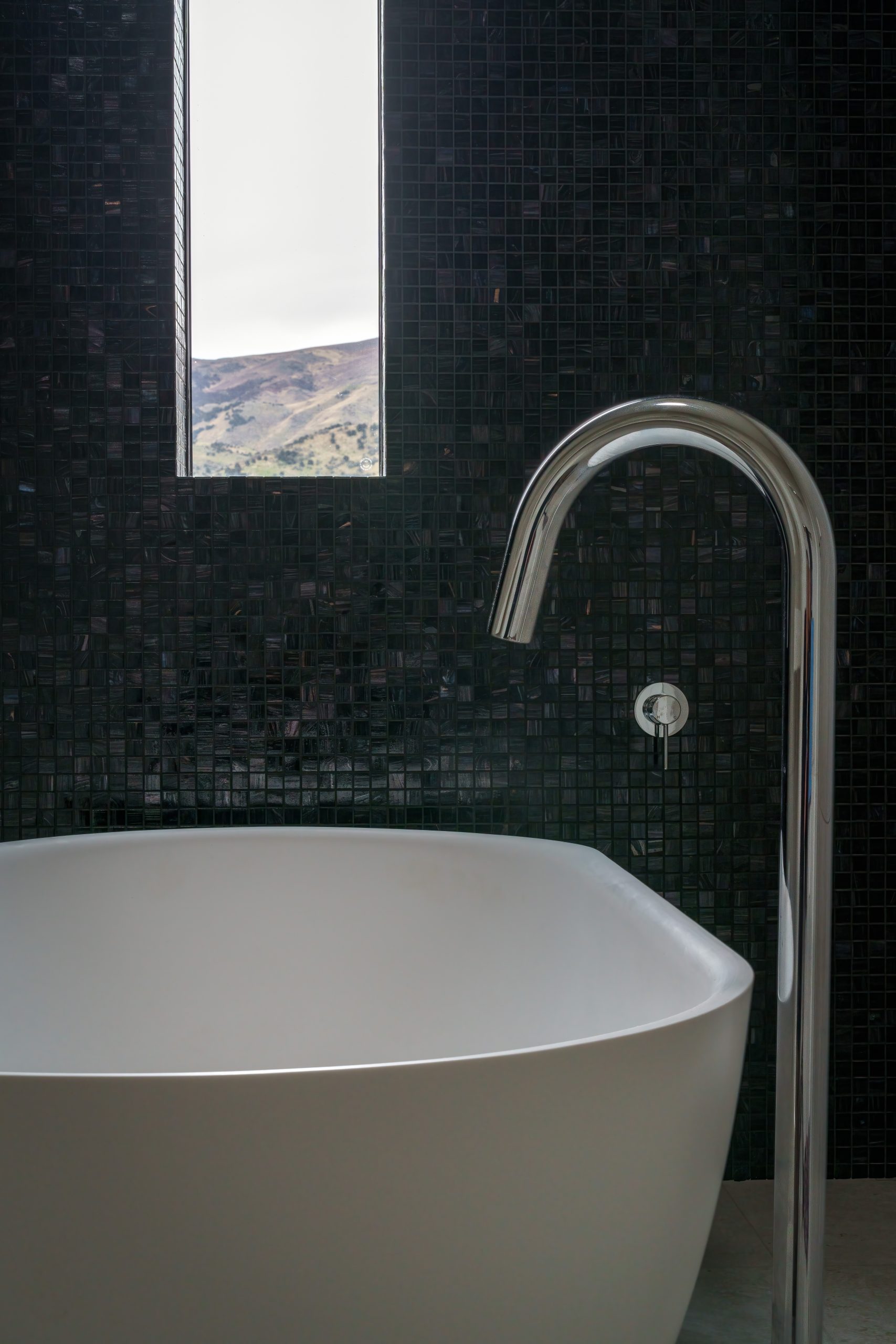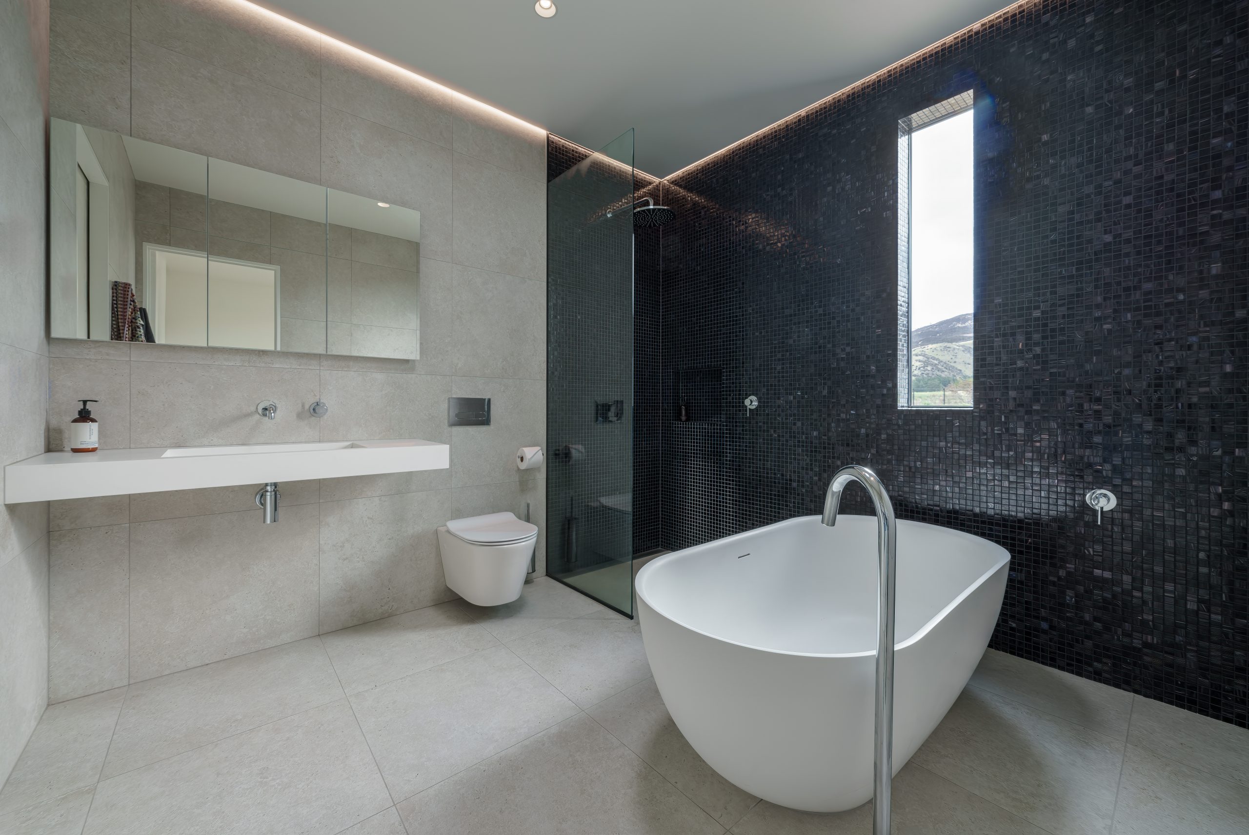 The master bathroom’s floor-to-ceiling tiling, combined with a freestanding soaking tub and a frameless mirror, transforms it into a relaxation retreat. Vincent from Bespoke Architecture mentioned, “The bathrooms are a standout, especially the powder room. The choice of dark, rich tiles creates a calming, soothing atmosphere.”