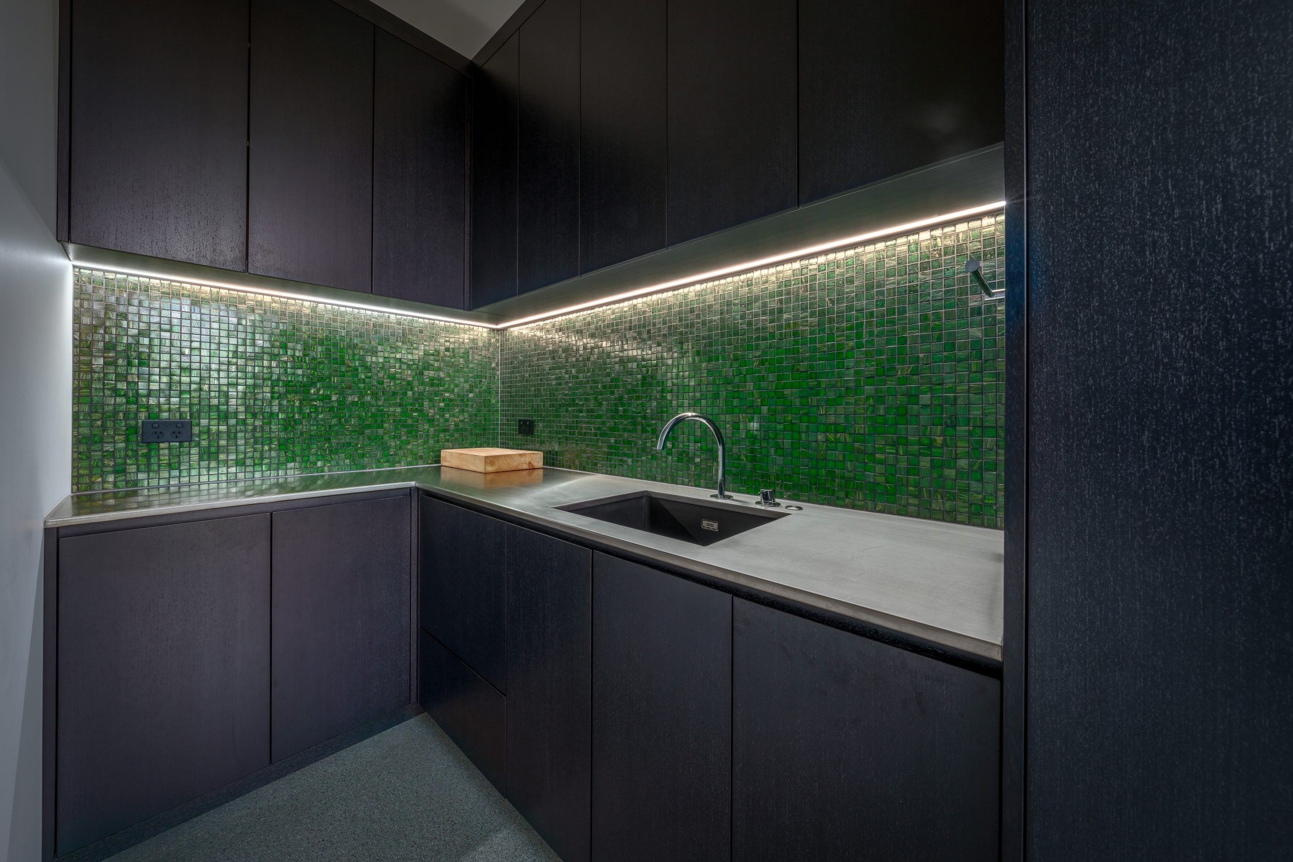 The kitchen, supplied by the client, is an example of understated sophistication. Designed with a matte-black finish and a vibrant green splashback, it serves as a stylish yet functional spot for entertaining. Plenty of storage and a workspace ensure practicality without compromising on aesthetics.