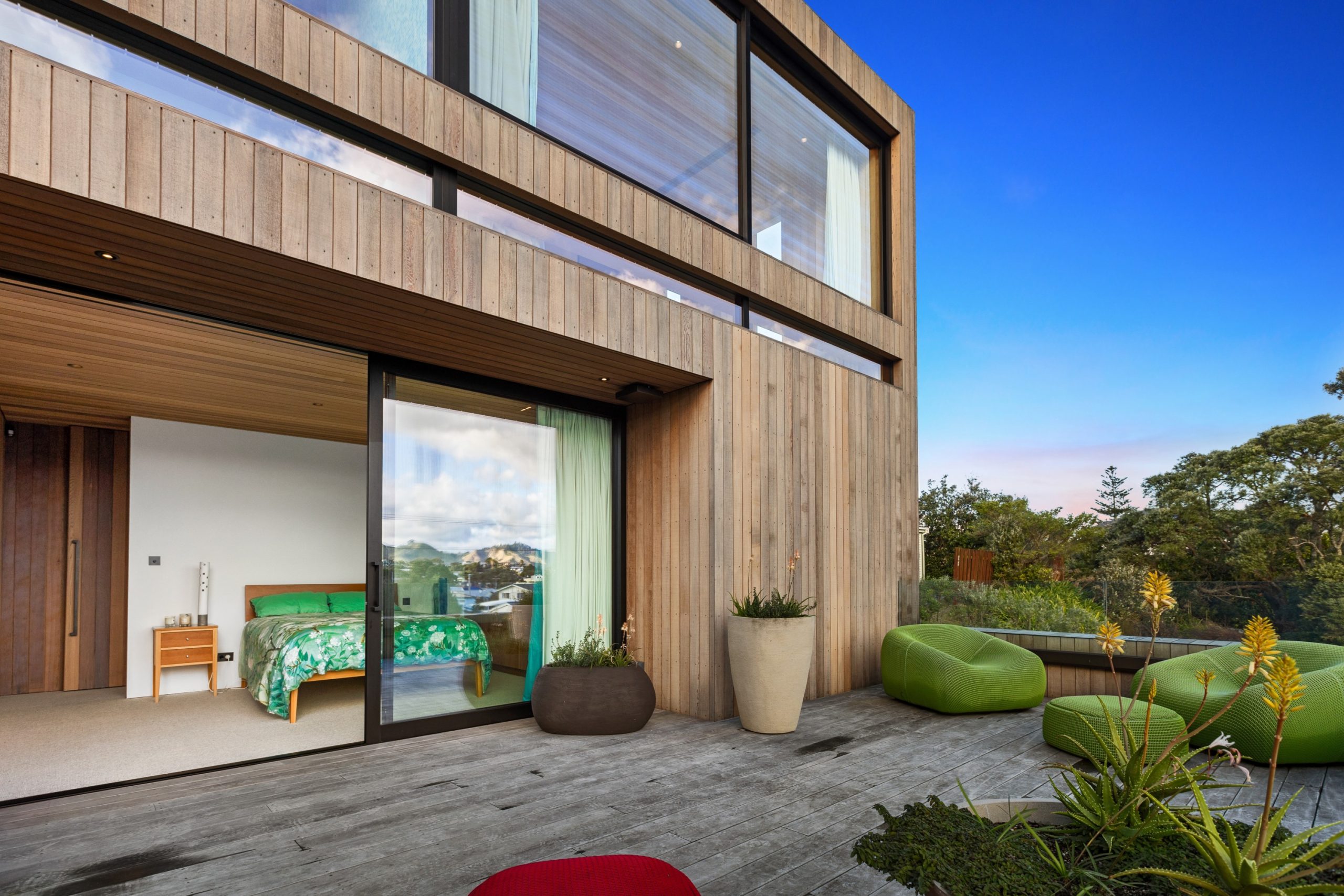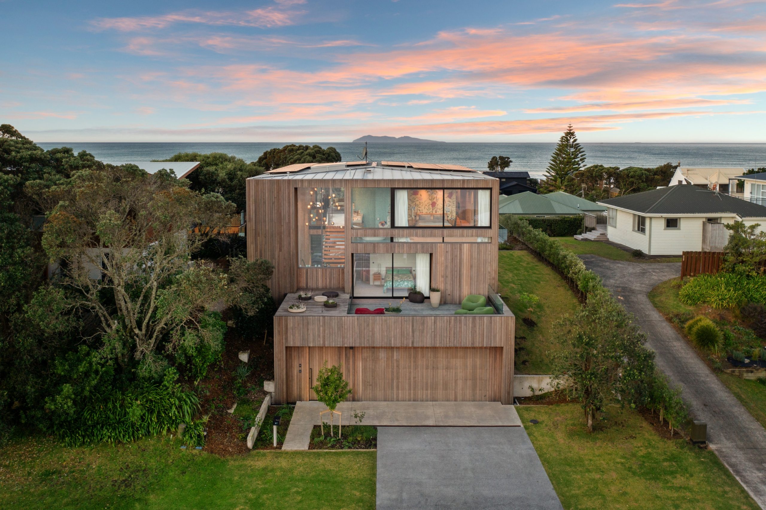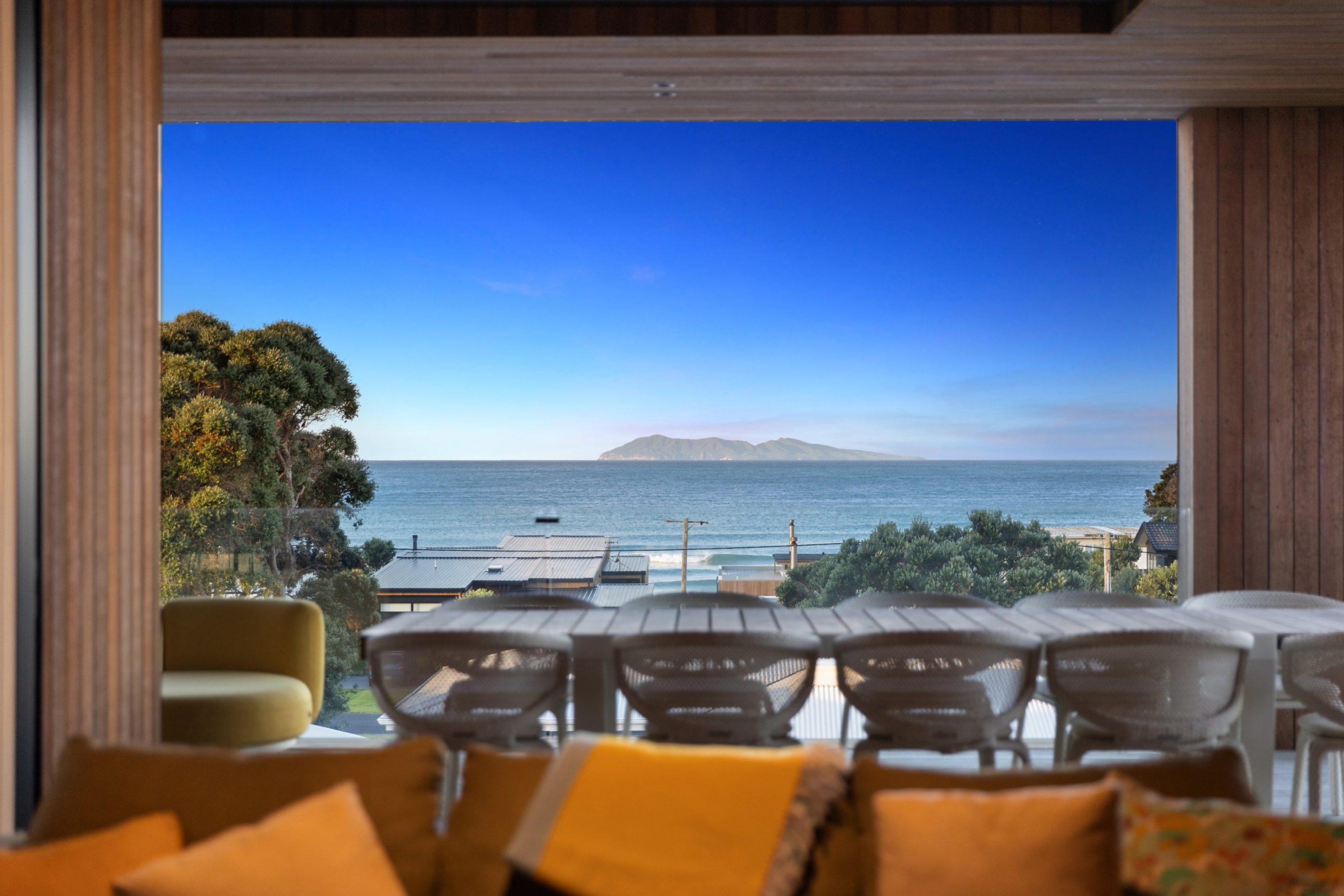 The three-level home features an elevator for accessibility. Its lower floor acts as the entryway with a spacious garage and lobby. The ground floor has two guest suites and a study lining the lush loggia. The top floor’s open-plan living room overlooks Waihi Beach and also houses the master bedroom.