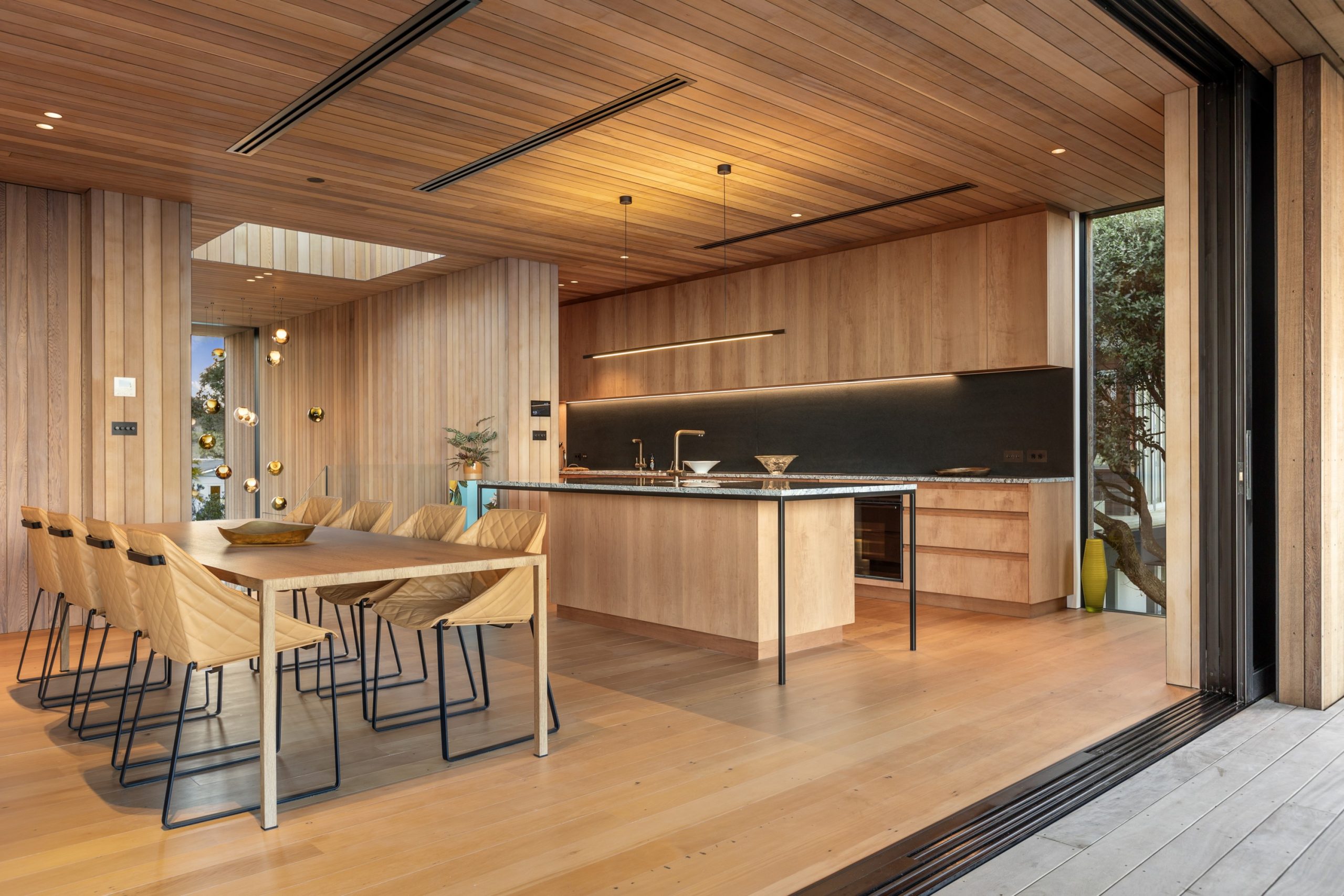 Typically, cedar would feature in a darker colour than it does across this project. The client’s desire for a more natural presentation was one that the House of the Year judges celebrated. Achieving the intuitive colour scheme took a great deal of thought, Dave says. The seamless cedar that graces most surfaces was stained only once, with a custom hue being found. From RK Timbers, the material is never used haphazardly. Kauri from an old sawmill, which was recycled, dried, and processed, forms the key component of the flooring.