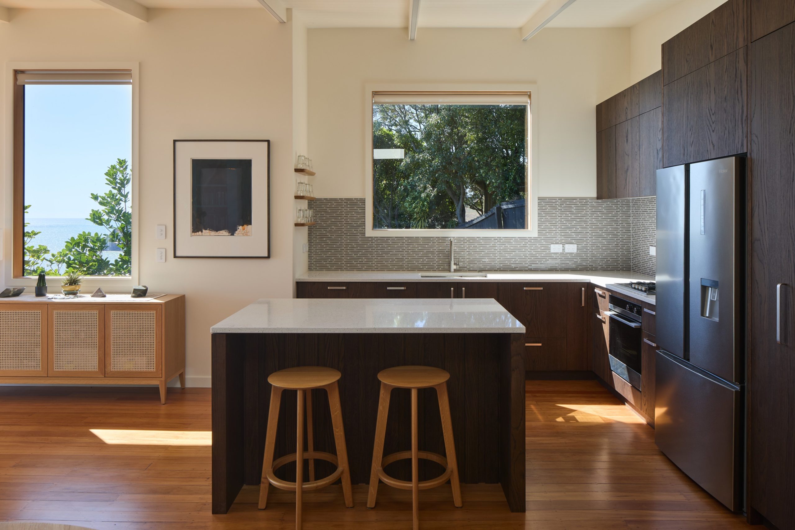 A new timber boardwalk winds its way up from the garage to the house, a journey through the bush with small platforms and perches offering places to rest, reflect, or simply take in the changing light and sea air.