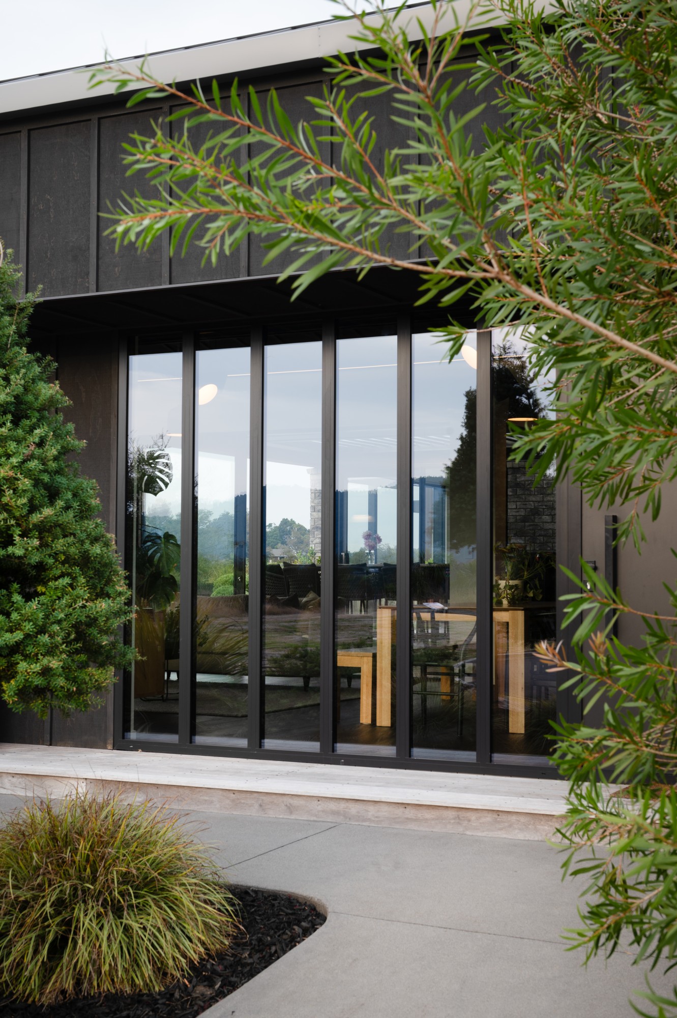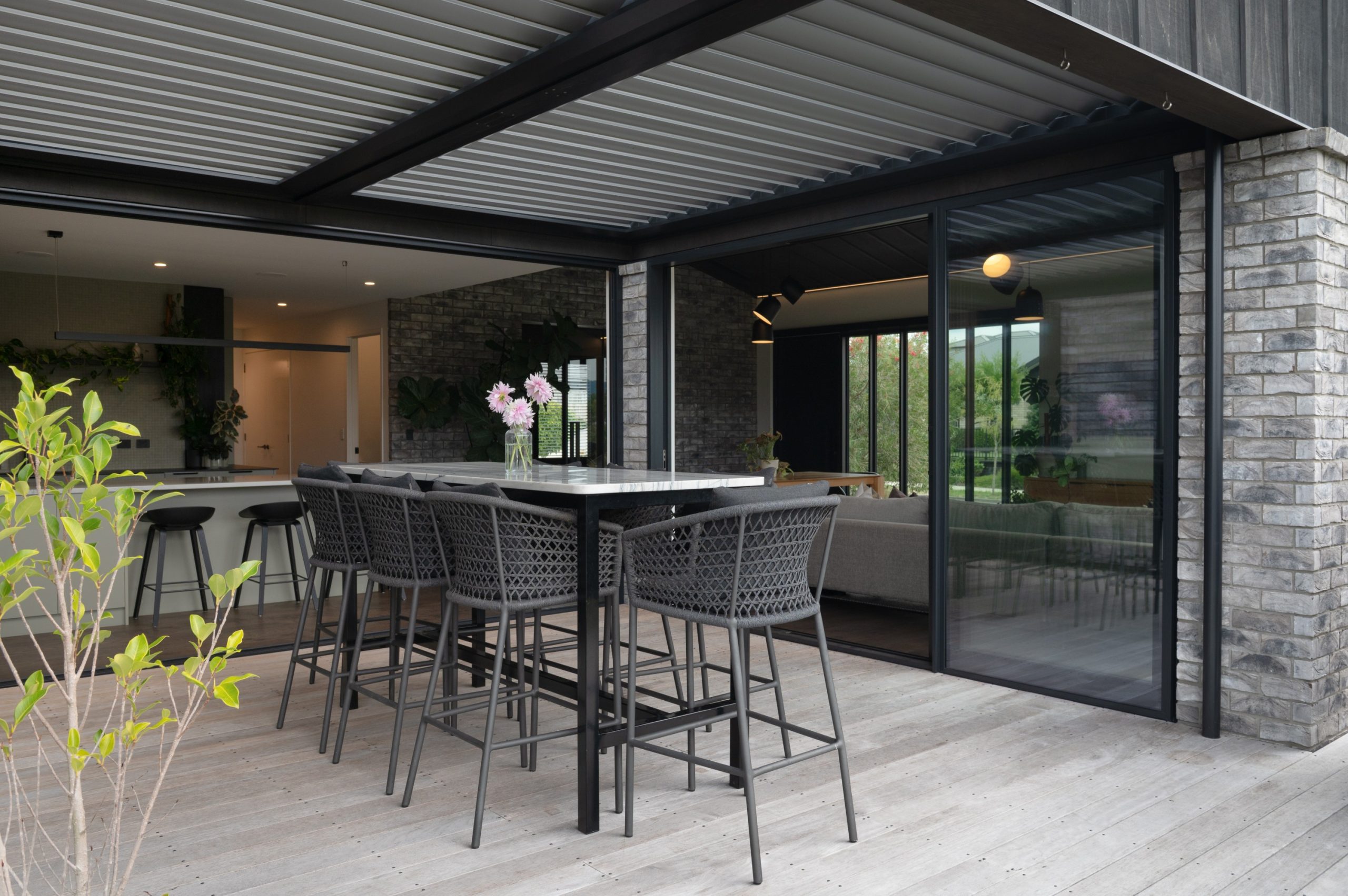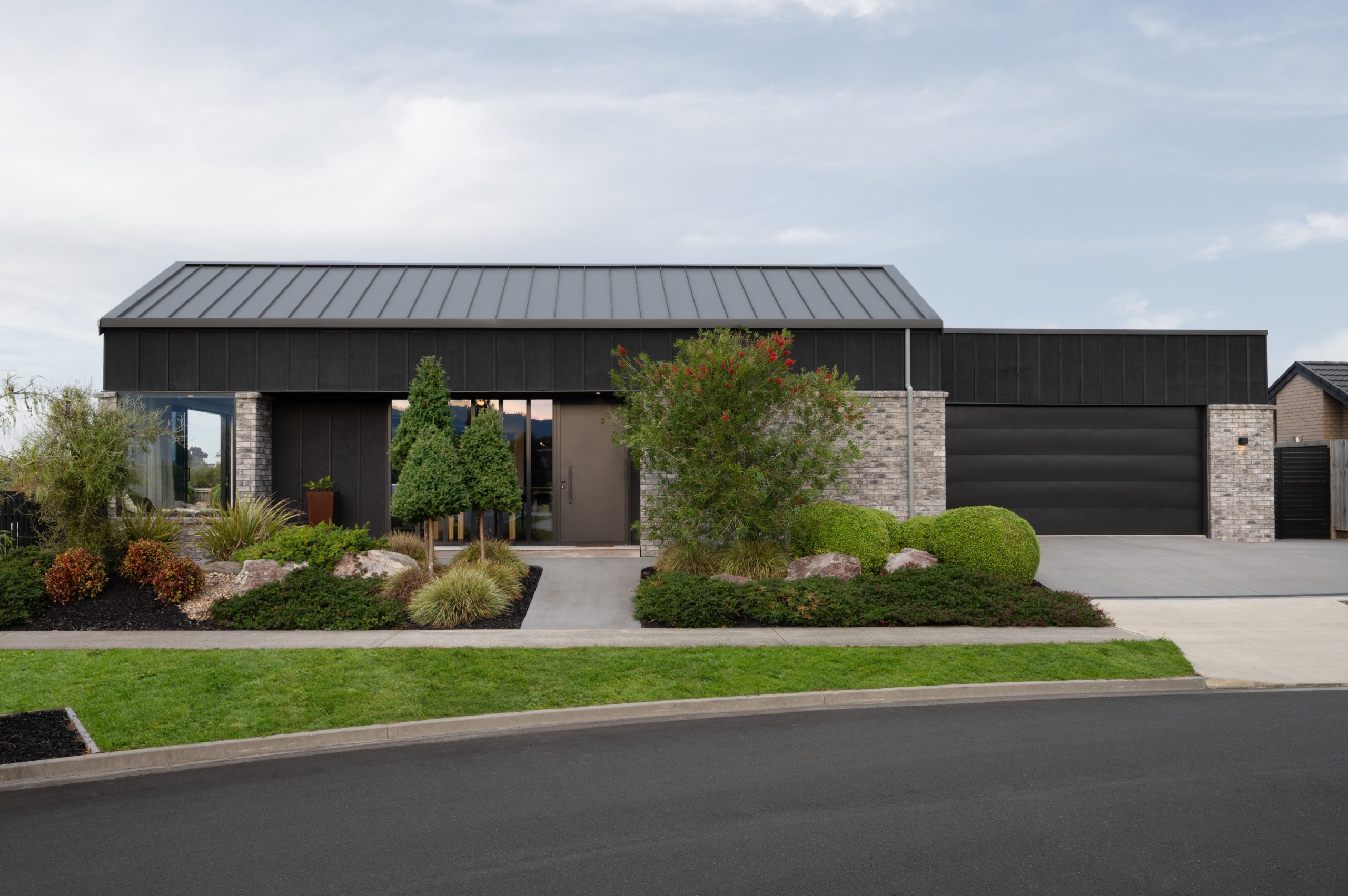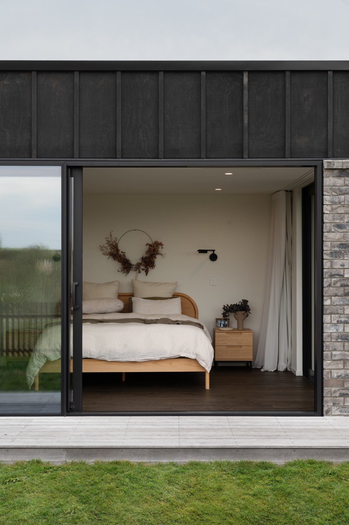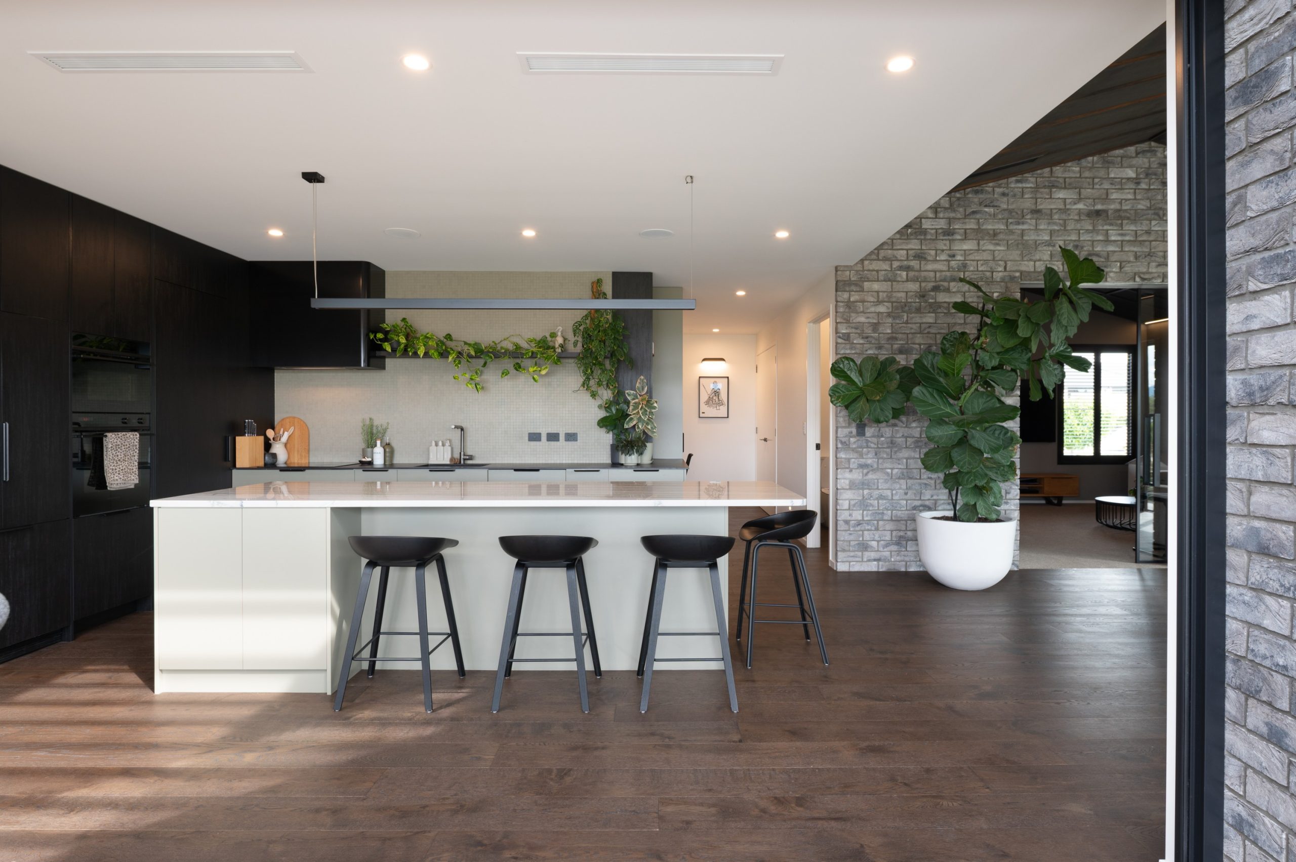 The exterior makes a striking first impression. With carefully planned features like a brick sill detail that allows joinery to blend seamlessly into the board and batten cladding, this home flows effortlessly from the ground up. Clean horizontal lines, custom aluminium mullions matched to batten spacing, and Eurotray roofing work together to create a crisp, refined silhouette. A curved, acid-etched concrete retaining wall meets cedar batten fencing, adding character to the roadside frontage. “Landscaping design gives the home an excellent street presence and sets the tone for what lies inside,” says Brad. It’s an exterior that encloses a home as well as introduces it.
