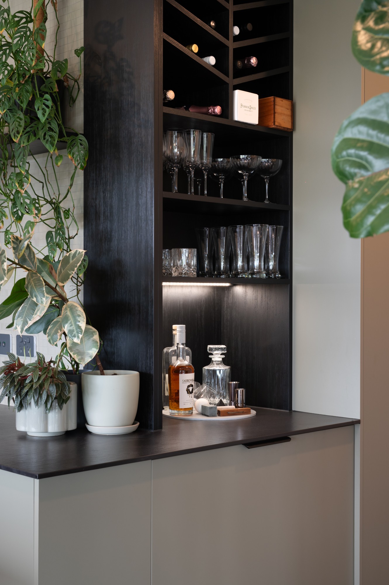 At the centre of it all is the kitchen, a showstopper by design. The island bench is uninterrupted by appliances, allowing the stunning Macaubus stone to take full focus. A custom rangehood designed by Brad’s father-in-law adds a personal touch. A hidden door leads to a spacious scullery with ample storage and a second sink. The integrated bar area, featuring a glassware display and a beverage drawer, adds instant hosting appeal. Integrated appliances throughout ensure a clean, streamlined look.