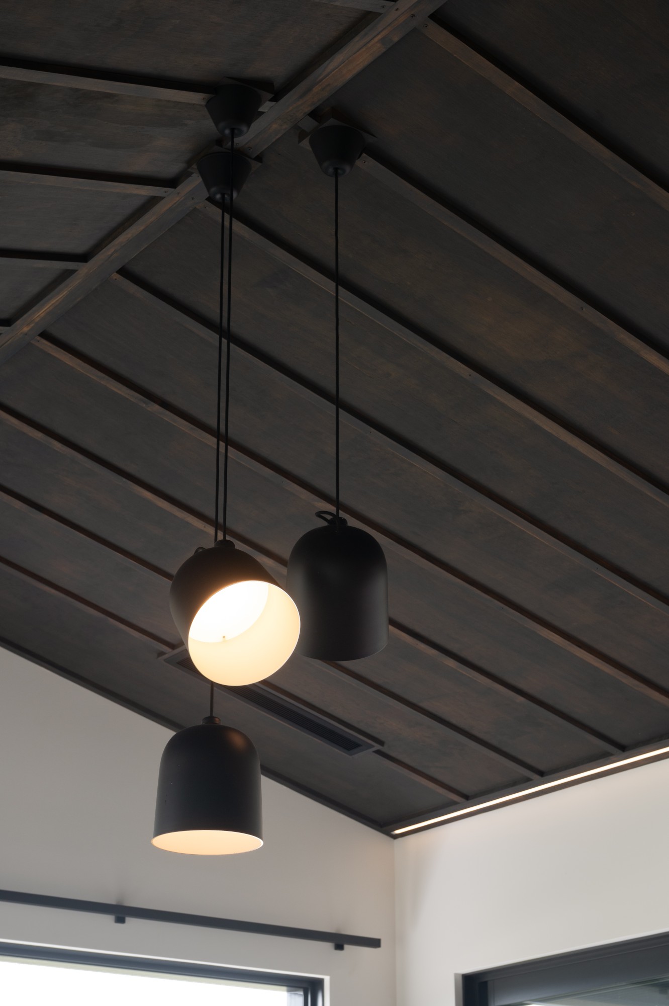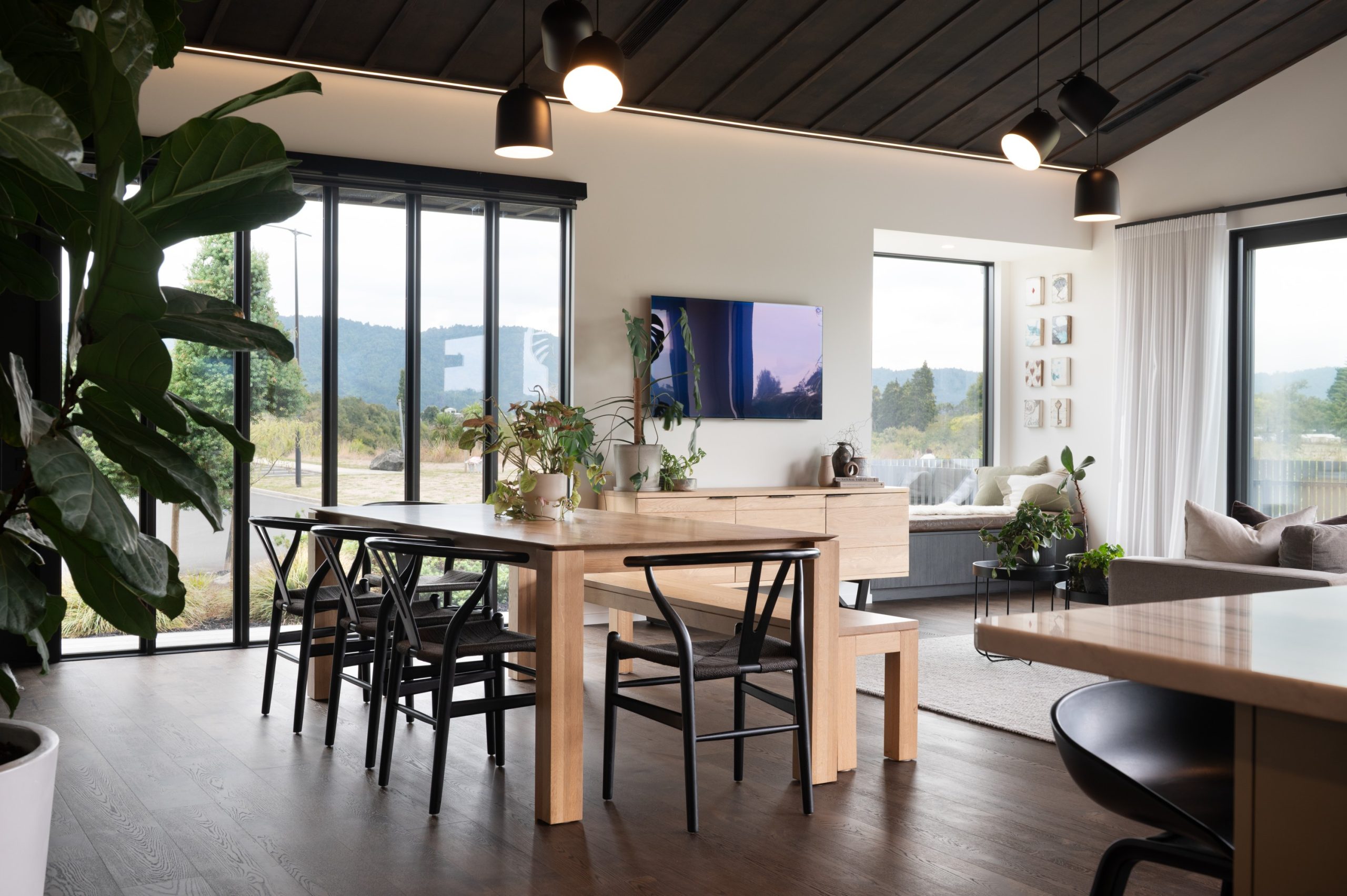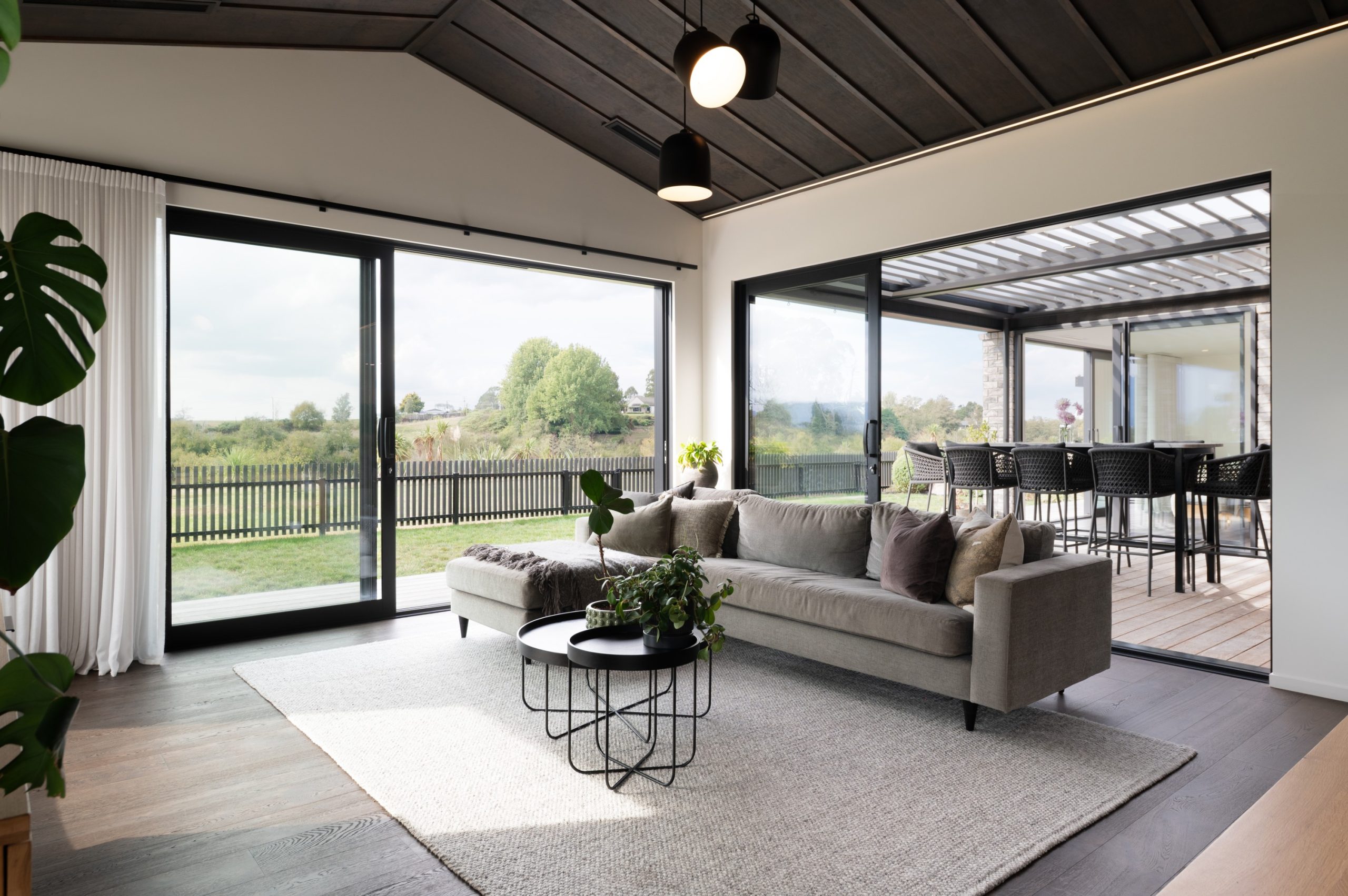 Step inside and you’re greeted by an open-plan layout that immediately feels both spacious and grounded. “You enter the home straight into the dining area, which is all open plan,” explains Brad. A standout feature is the living area’s board and batten ceiling, complete with dimmable strip lighting and pendant clusters that minimise visual clutter.