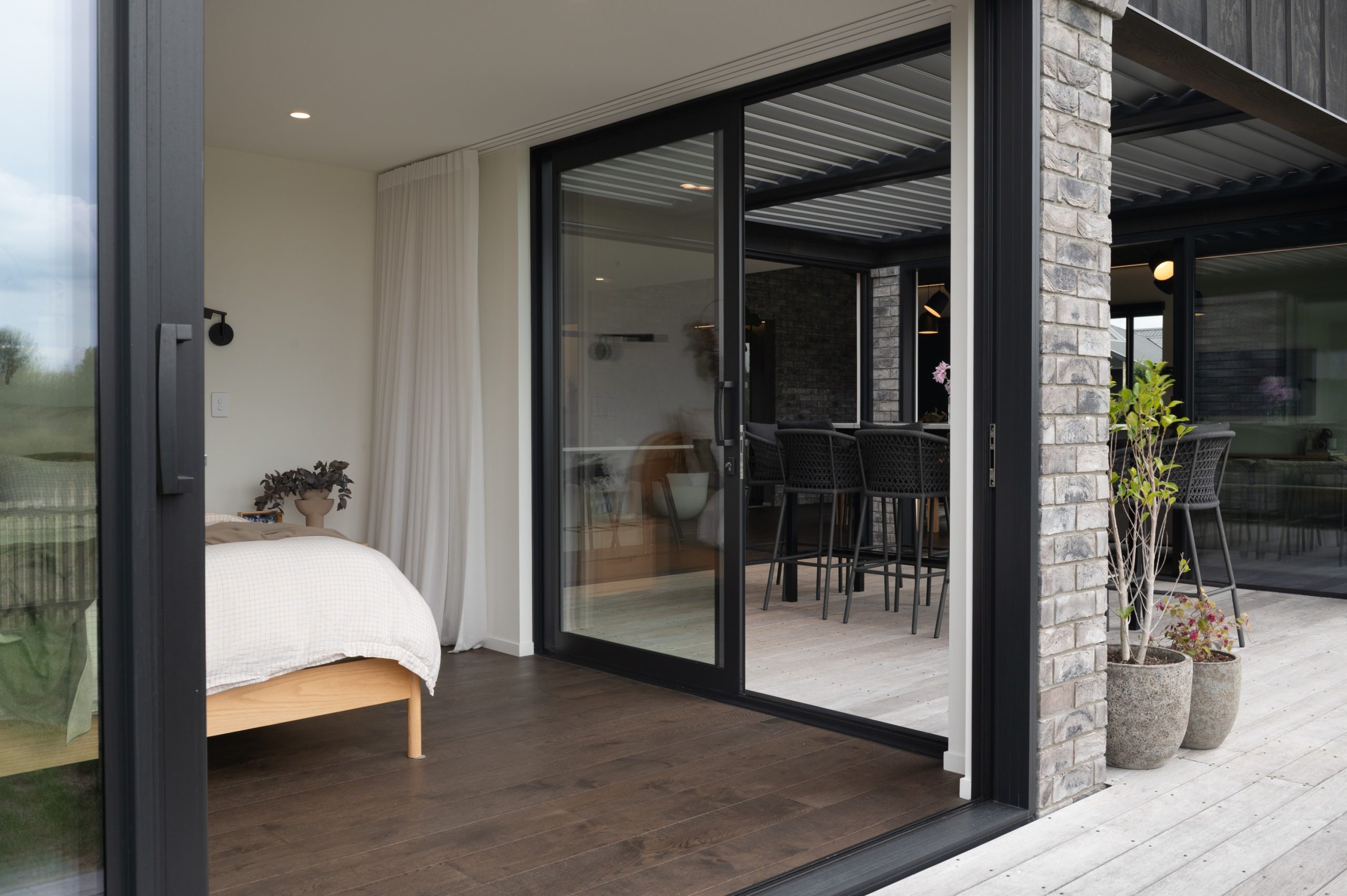 As with the rest of the home, the bathrooms reflect thoughtful design. A terrazzo-tiled powder room features a bold green freestanding basin, while skylights in both internal bathrooms usher in natural light. “Nib wall detail in all bathrooms helps the seamless transition between tiles and paint,” Brad notes. The master suite is cleverly tucked behind a walk-through wardrobe that echoes the kitchen’s cabinetry colours, maintaining design cohesion. Children’s bedrooms feature playful accents, such as a feature wall, while the master bedroom enjoys expansive views of the Waikato River and opens directly onto the louvred deck. Between the warmth of the interior and the clever use of every corner, this home is a true reflection of Turton Builders’ belief in building with heart. “We love being involved from the initial concept of a build to completion,” says Brad, and this project shows just how powerful that involvement can be.