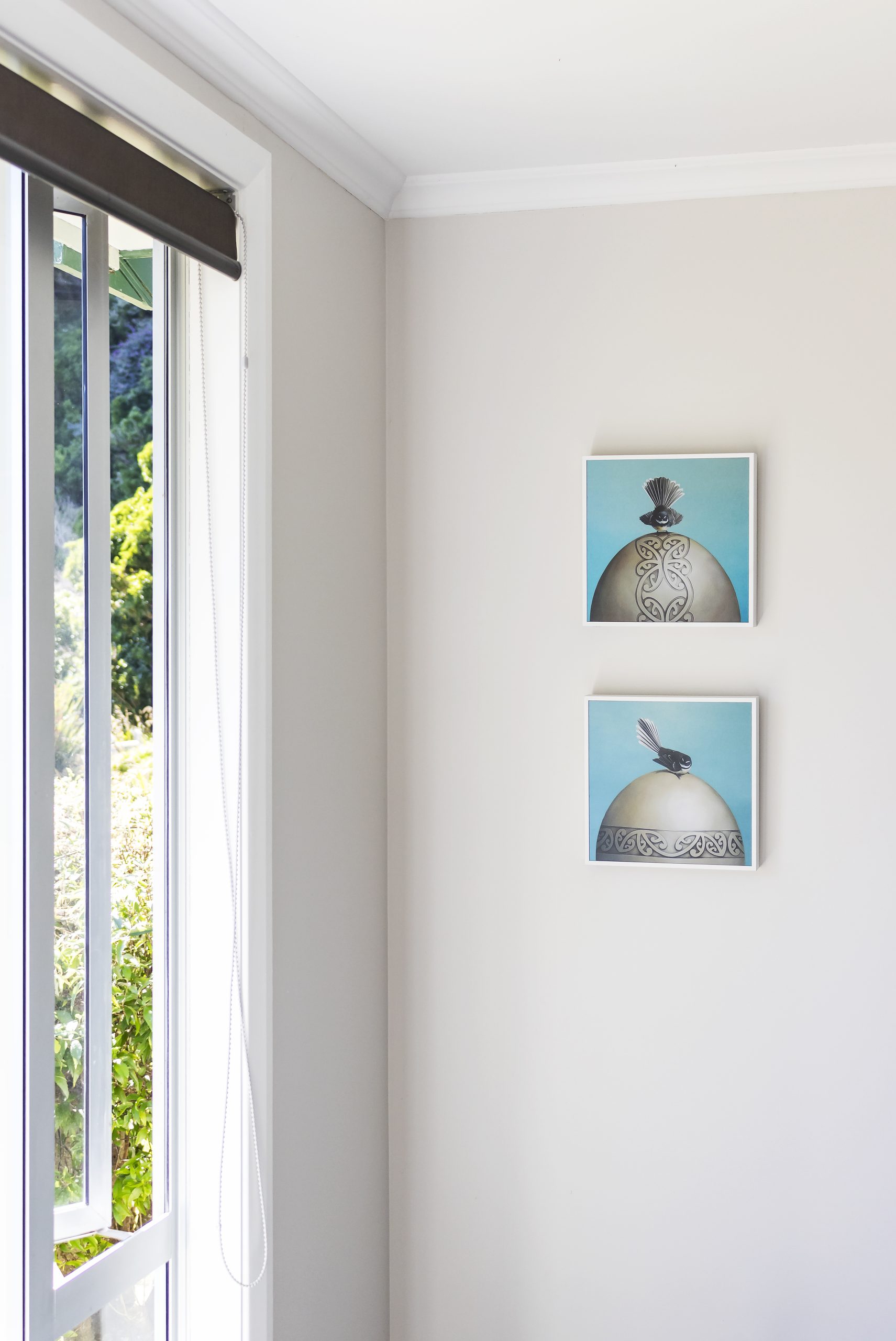 The client’s request was for a colour scheme that allowed the bach to blend into its natural surroundings while feeling fresh and updated. Avril approached this with a palette of muted greens for the exterior. Inside, the main living space and hallway were kept light and neutral to maximise the sense of openness, while the bedrooms were personalised with moody blues and soft greens. 64