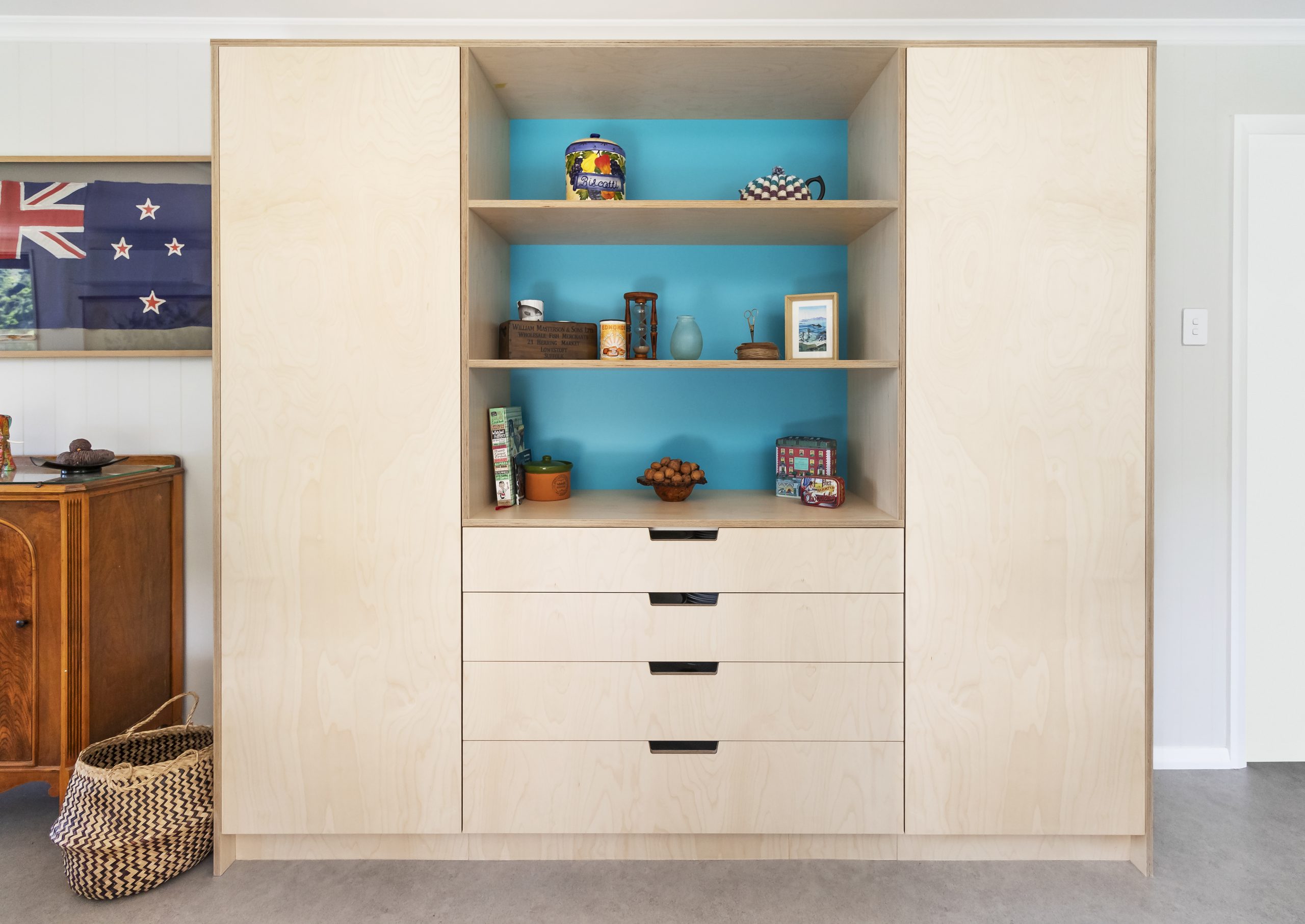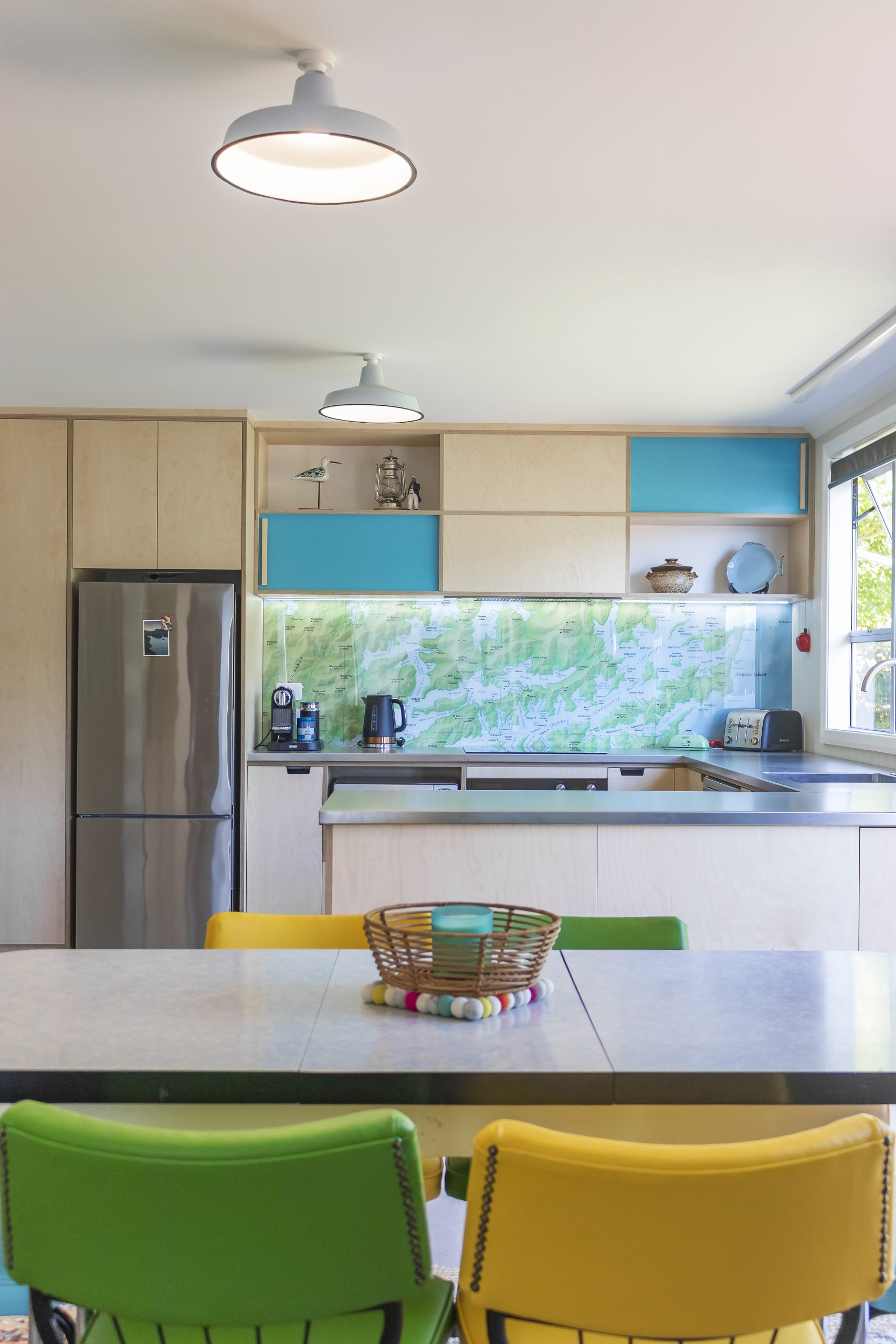 The kitchen is a focal point of the renovation, embodying a balance of practicality and personality. Designed with functionality at its core, it needed to accommodate multiple people cooking together while maintaining a relaxed and inviting atmosphere. Avril and her client worked closely with Max George Joinery, a local joinery company, to bring the vision to life with a hands-on approach. The materials were selected for both durability and aesthetic appeal, including plywood for cabinetry and stainless-steel linen finish for the benchtops. Thoughtful details like raw ply edges, cut-out pull handles, and sliding retro shelf cupboards add to the space’s rustic charm. A standout feature is the custom glass map splashback, which serves as a practical guide for the clients, showcasing local waters and fishing spots. Another key element was the preservation of the family’s oak booze cabinet, which remains a centrepiece beside the newly installed kitchen unit, integrating sentimental value into the new design.