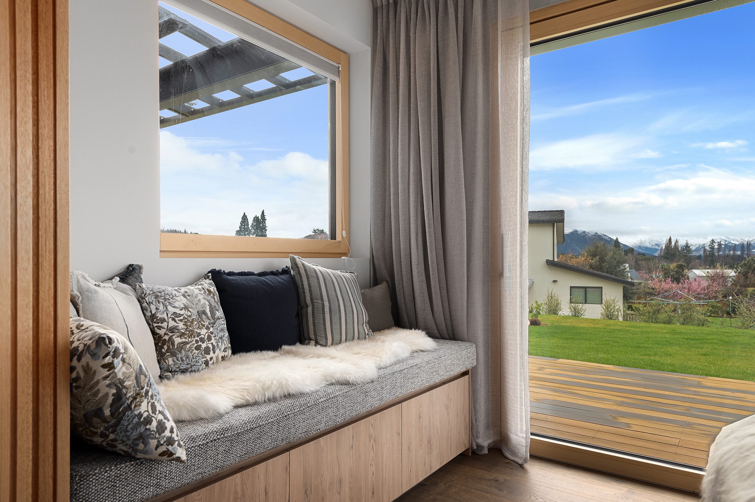 The kitchen “is a huge feature, the automatic high cupboard panels are a real treat to use,” says Mark about the joinery, which was completed by Tarras-based HBH Joinery and exudes the ideal blend of luxury and lakeside seclusion.