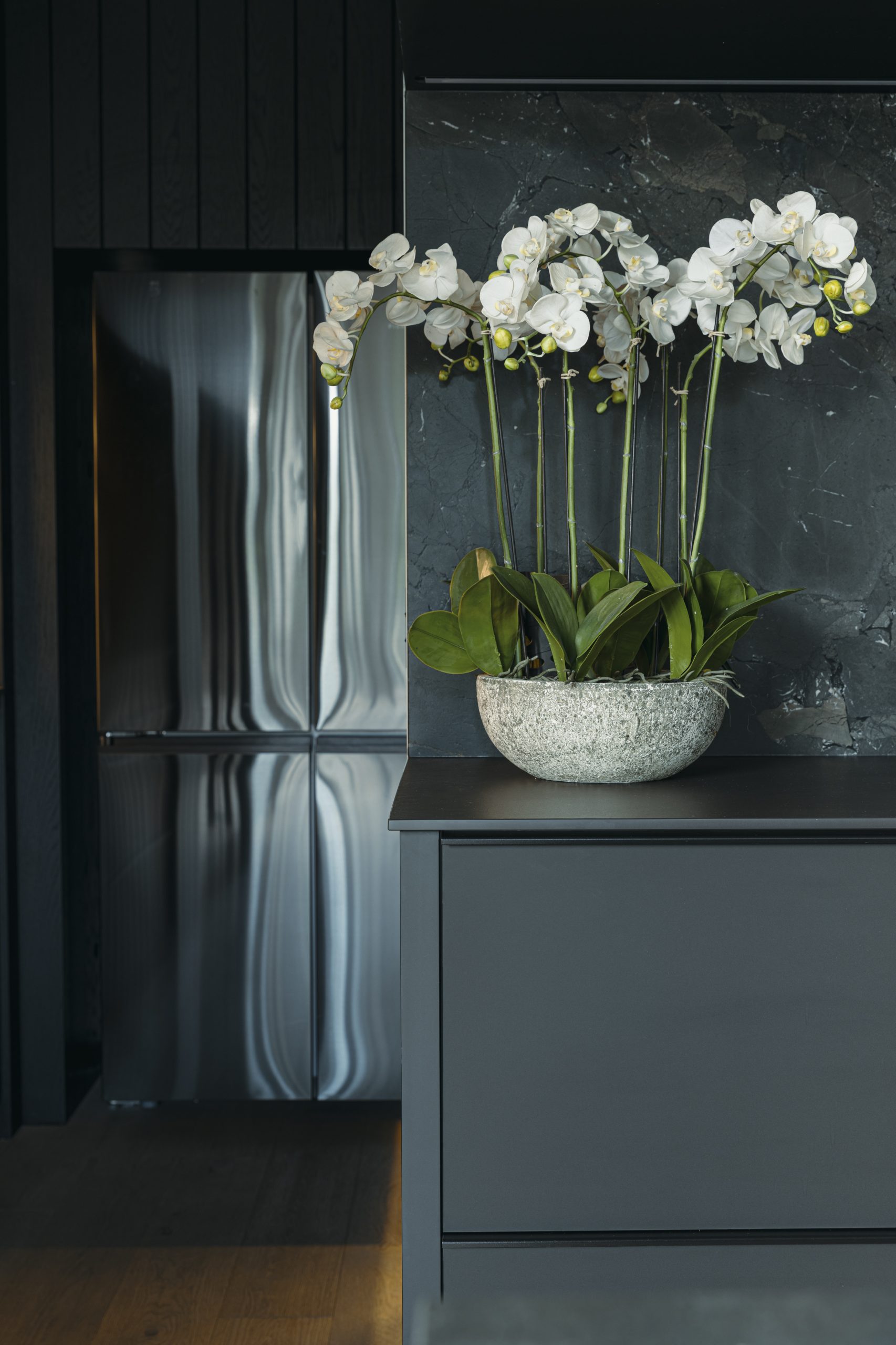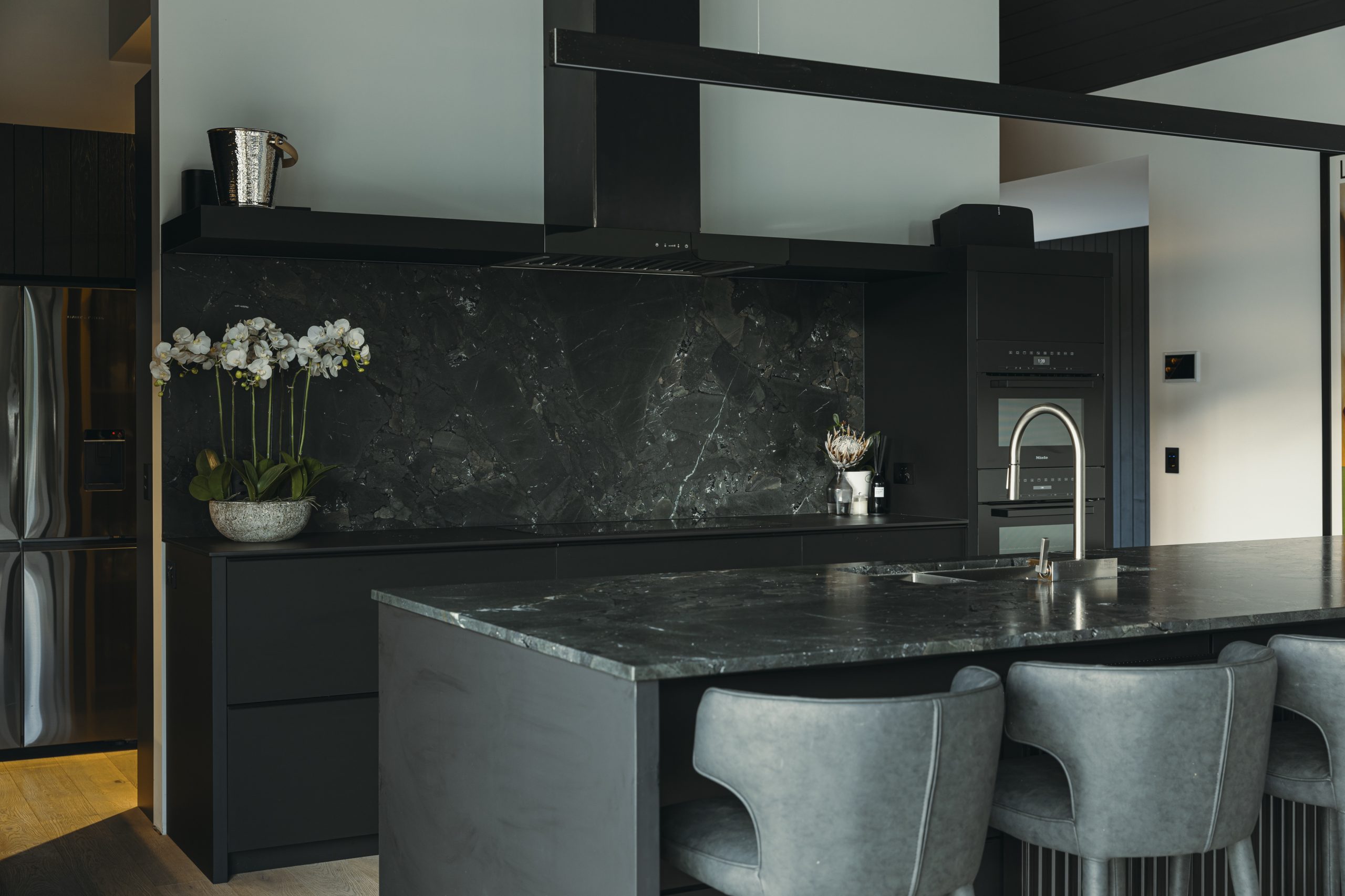 Meticulously designed by Stuart Bateman, this Queenstown kitchen blends innovation and luxury in perfect harmony. Anchoring the space is Fenix HMR MDF in Nero, complemented by a Quartzite Island and Dekton tops. The natural timber veneer on the bar area creates a natural inviting area for socialising.