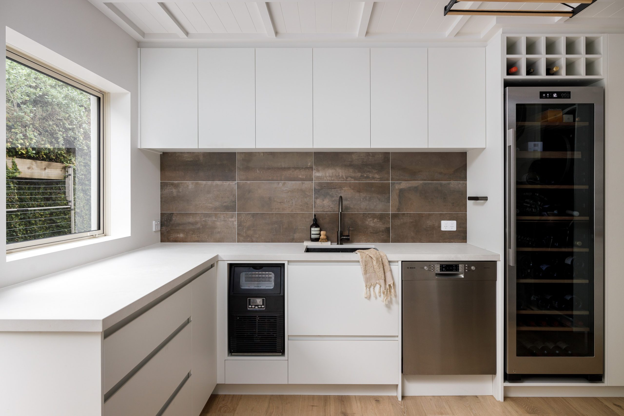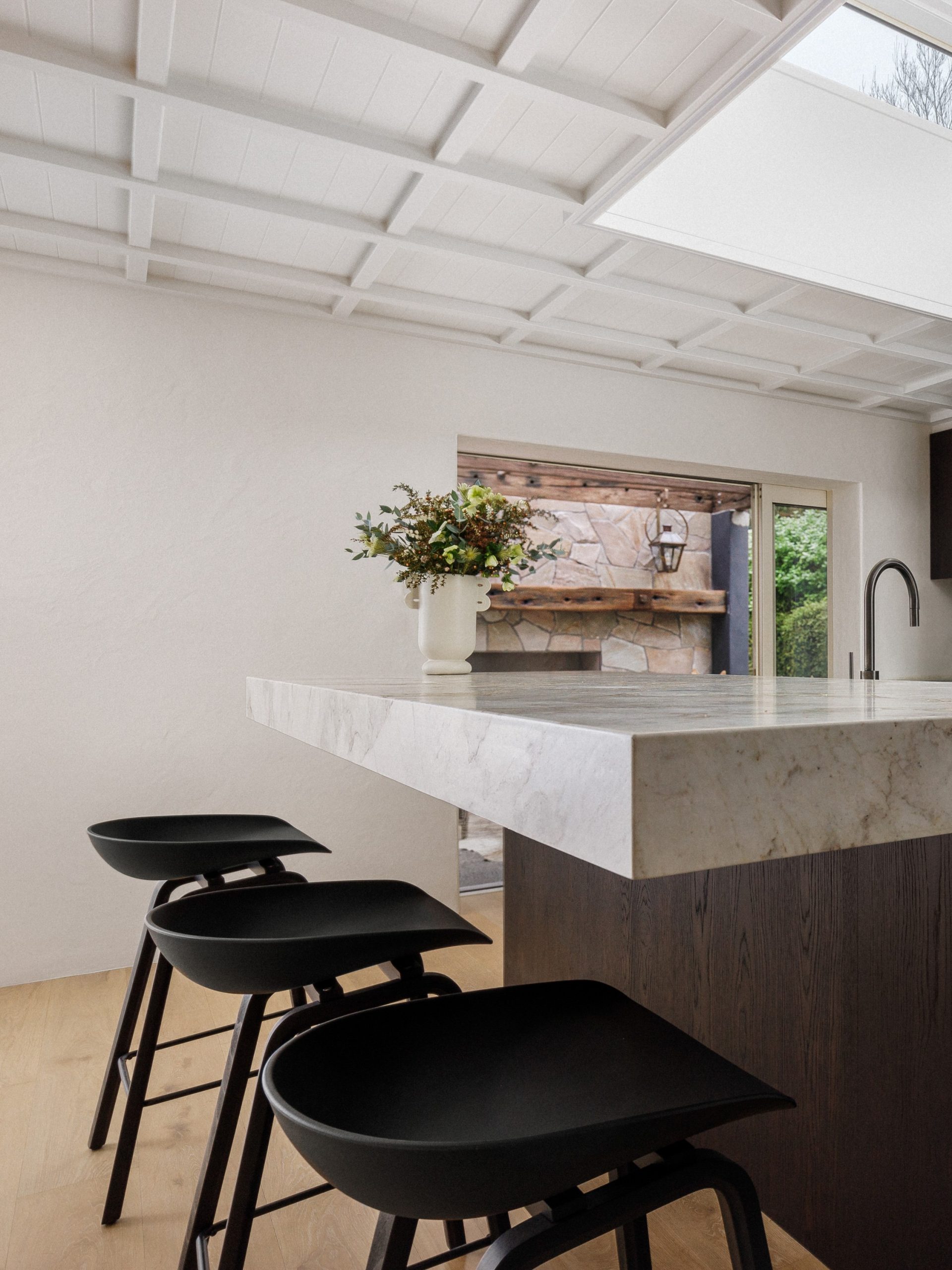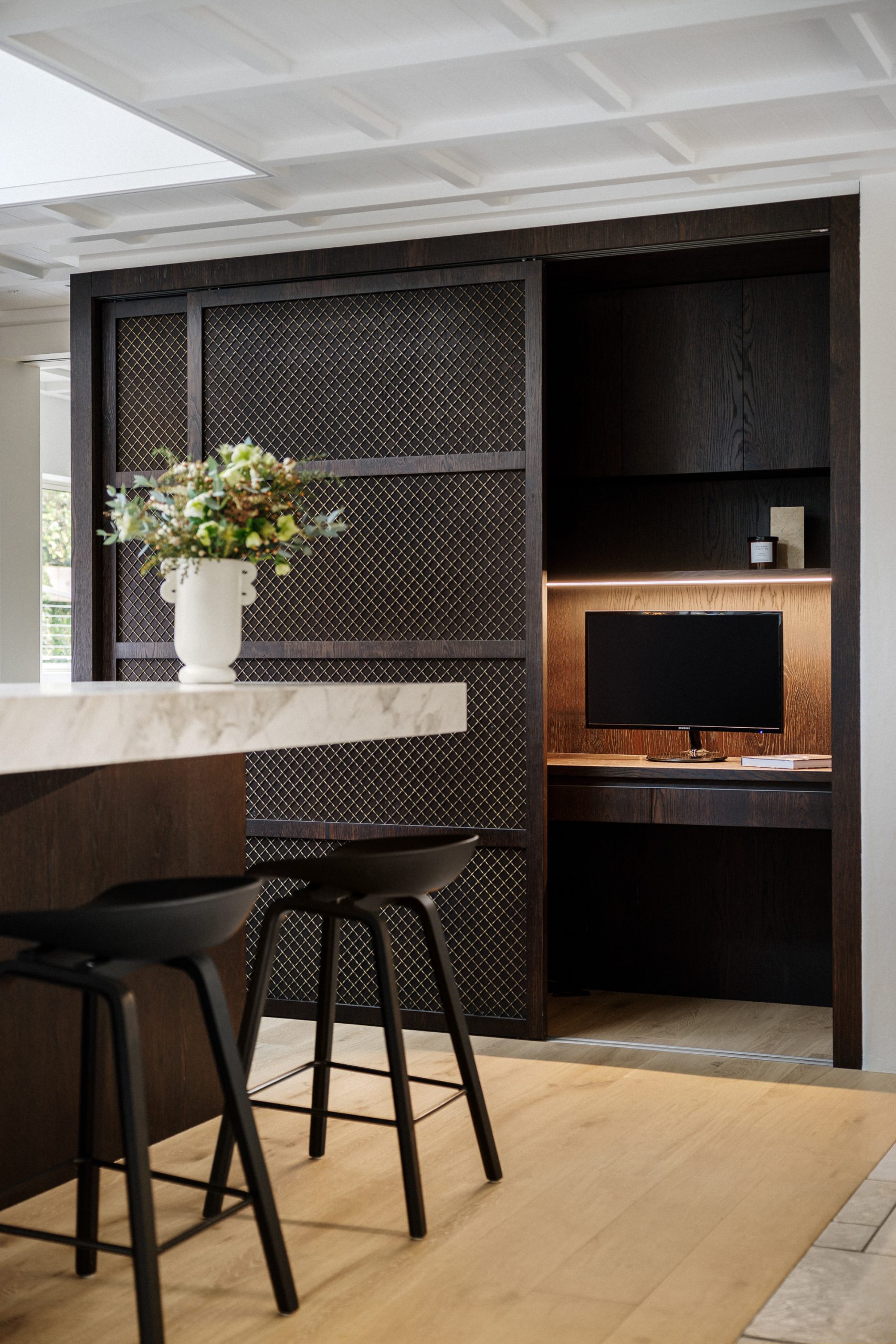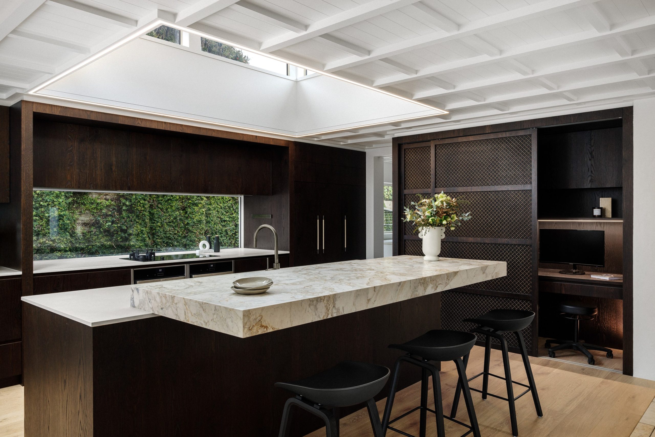 The cabinetry, crafted by The Kitchen Business, was aligned with the original battened ceiling to create a continuity which preserves the home’s architectural authenticity while embracing modernity.