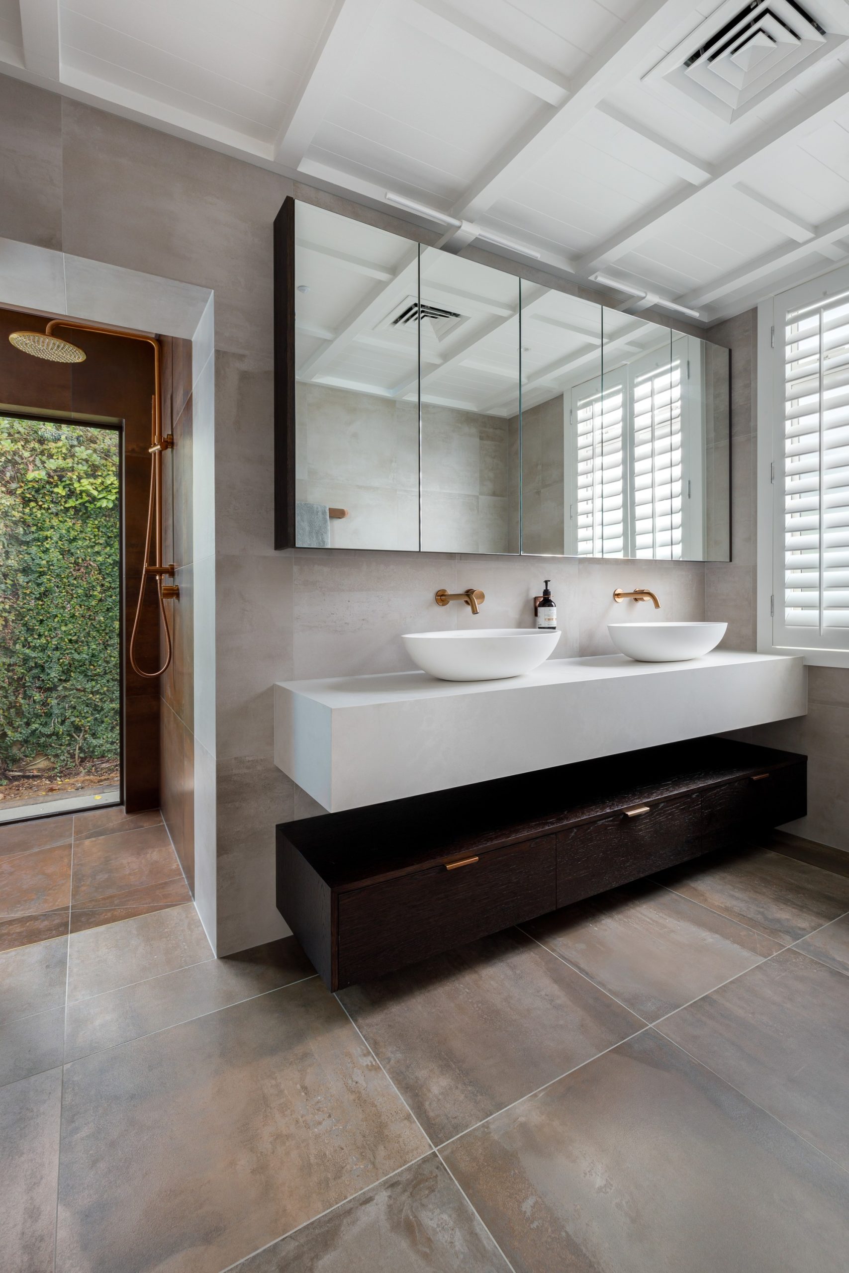 architecture and finishes. Thoughtful touches such as wall-mounted tapware, elegant stone benchtops, and cleverly concealed storage enhance both the visual and functional aspects of the bathrooms, offering moments of everyday indulgence. Even the most utilitarian features are executed with grace and intention.